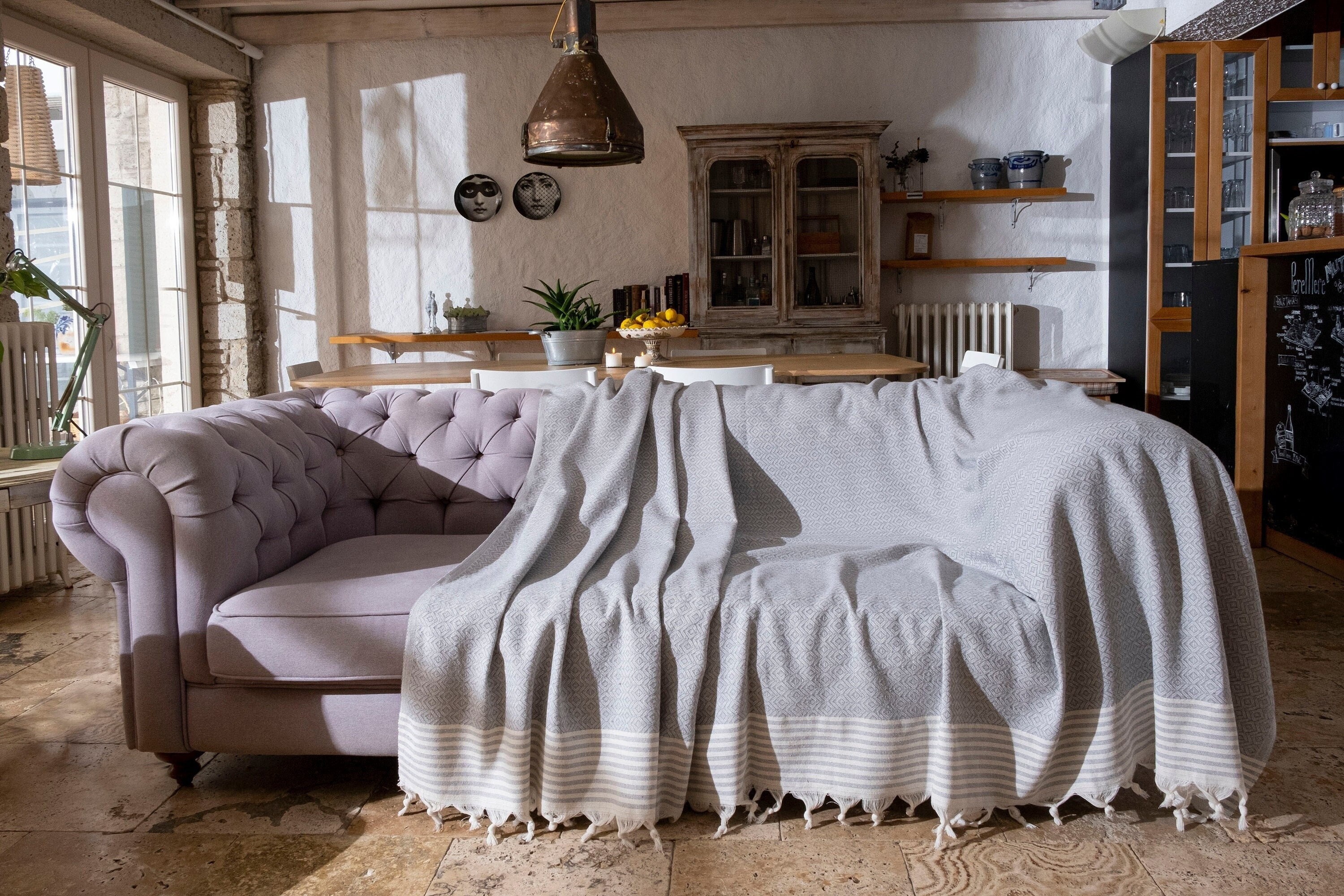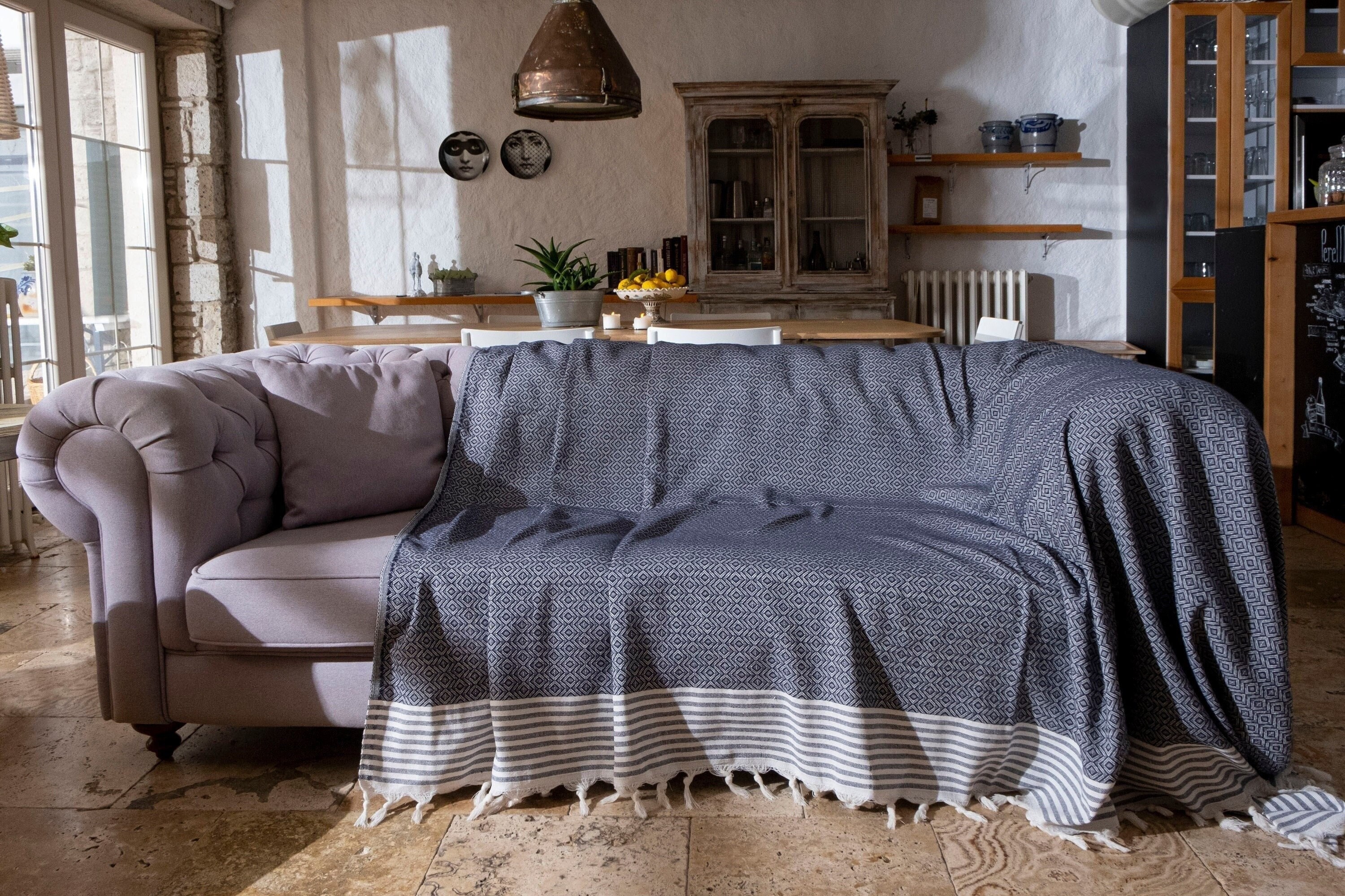 Large sofa cover blanket 125 x 70 inches. It is made specifically to cover large couch and sofas. Our sofa cover is great to protect your sofas from dust, dirt and cat scratches. Eclectic and bohemian diamond pattern is finished with tassels on the edge on this couch cover blanket.
